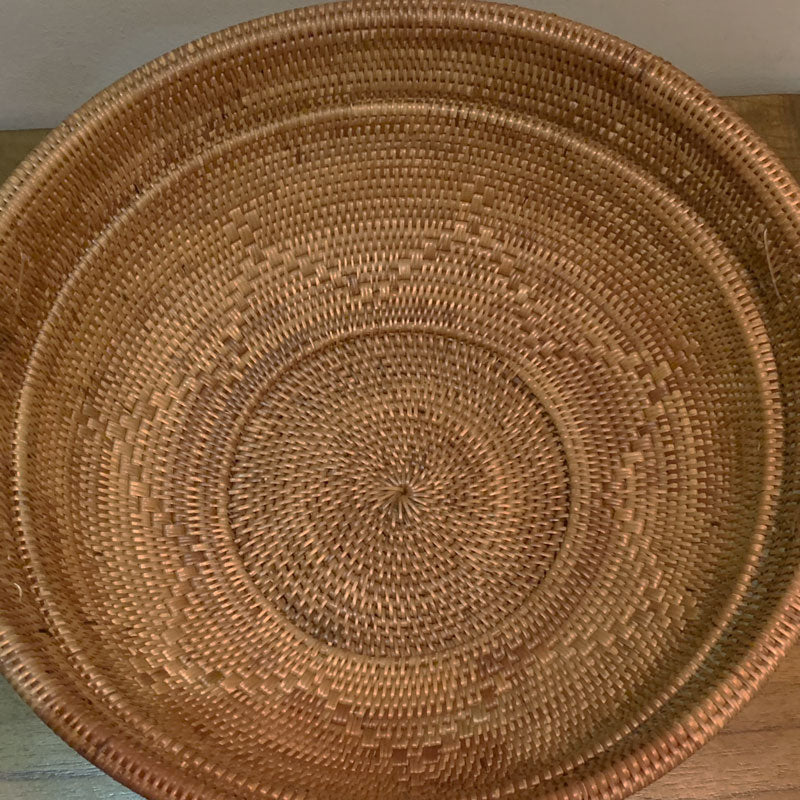 アタのツルは根元に行くほど太くて、先にいくほど細いという特徴を持っています。そのツルを様々な太さにして均等にするための小道具として、ファンタやコーラなどのビンのキャップ。大きさの異なる穴をいくつか開けて、その穴にツルを通し同じ太さのツルを揃えます。画像のように、1本1本丁寧に太いツルと細いツルを編み込んで商品を作りあげていきます。籠の模様になっている黒い部分はアタの根の部分を使用しバリ島の独特の模様を作り出しています。