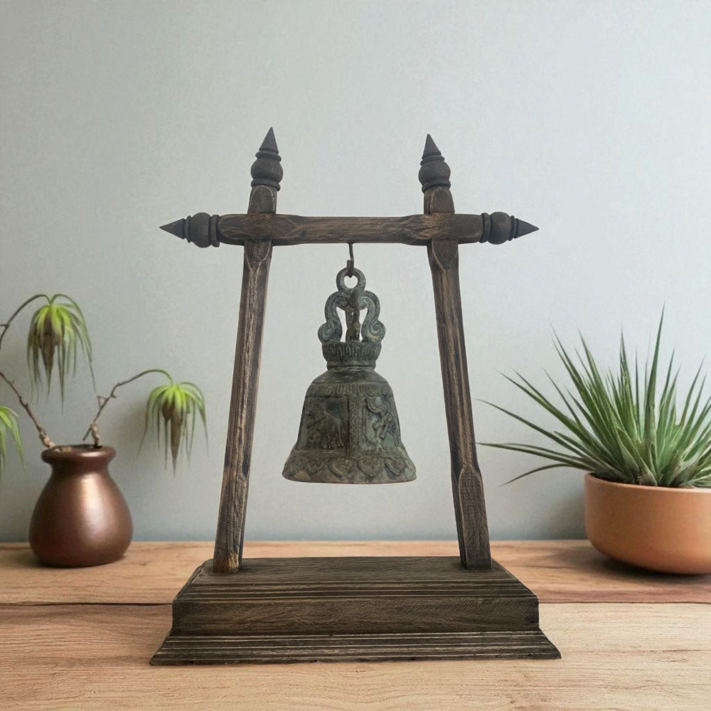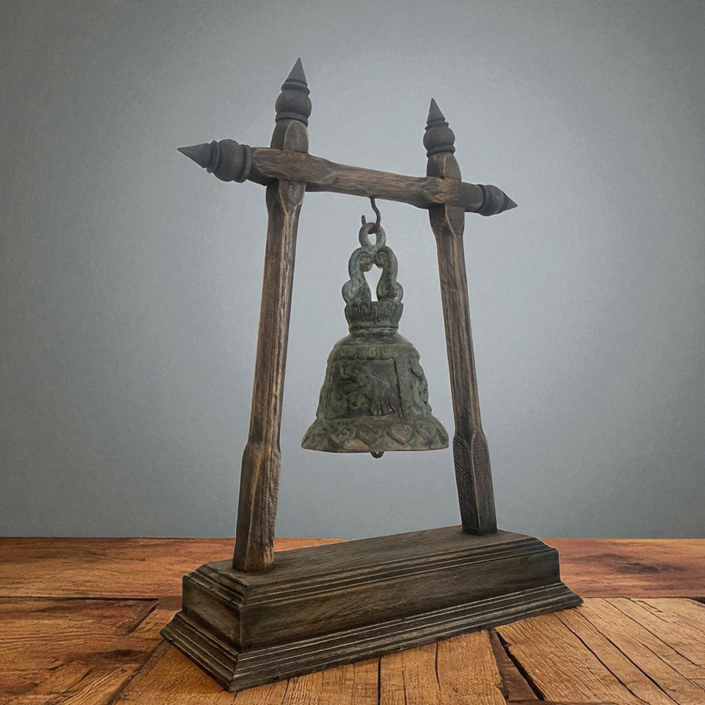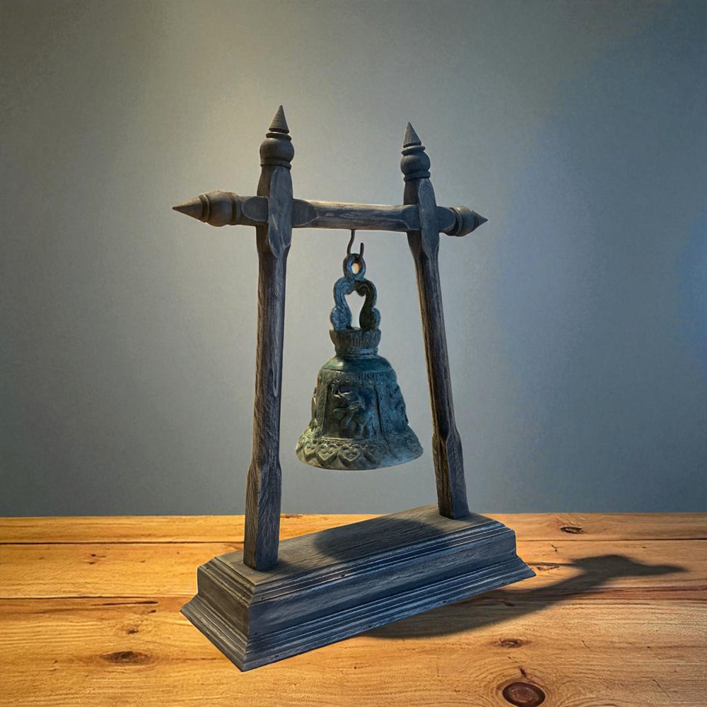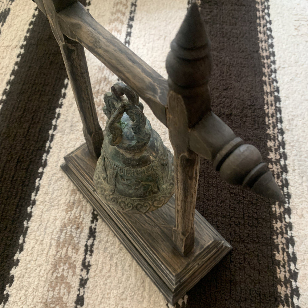 Myanmar Teak Wood Brass Bell Handmade Stand Interior Objet
