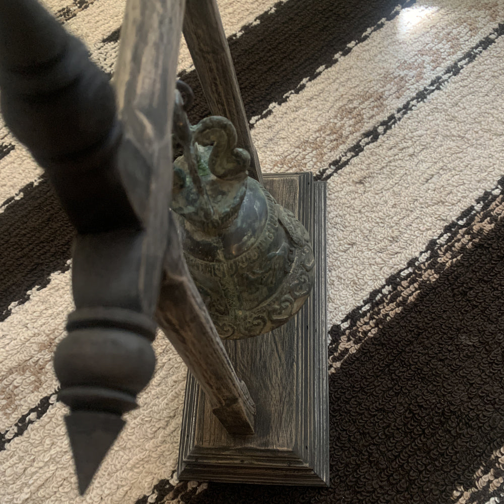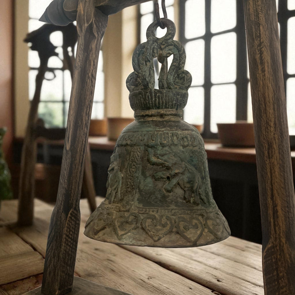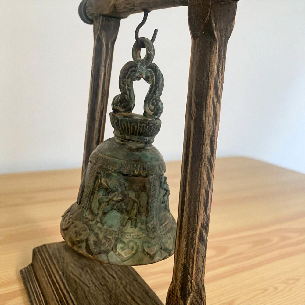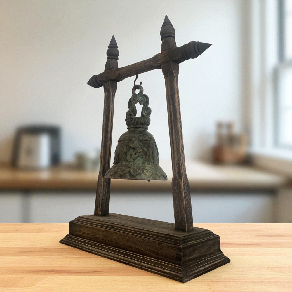 Myanmar Teak Wood Brass Bell Handmade Stand Interior Objet
