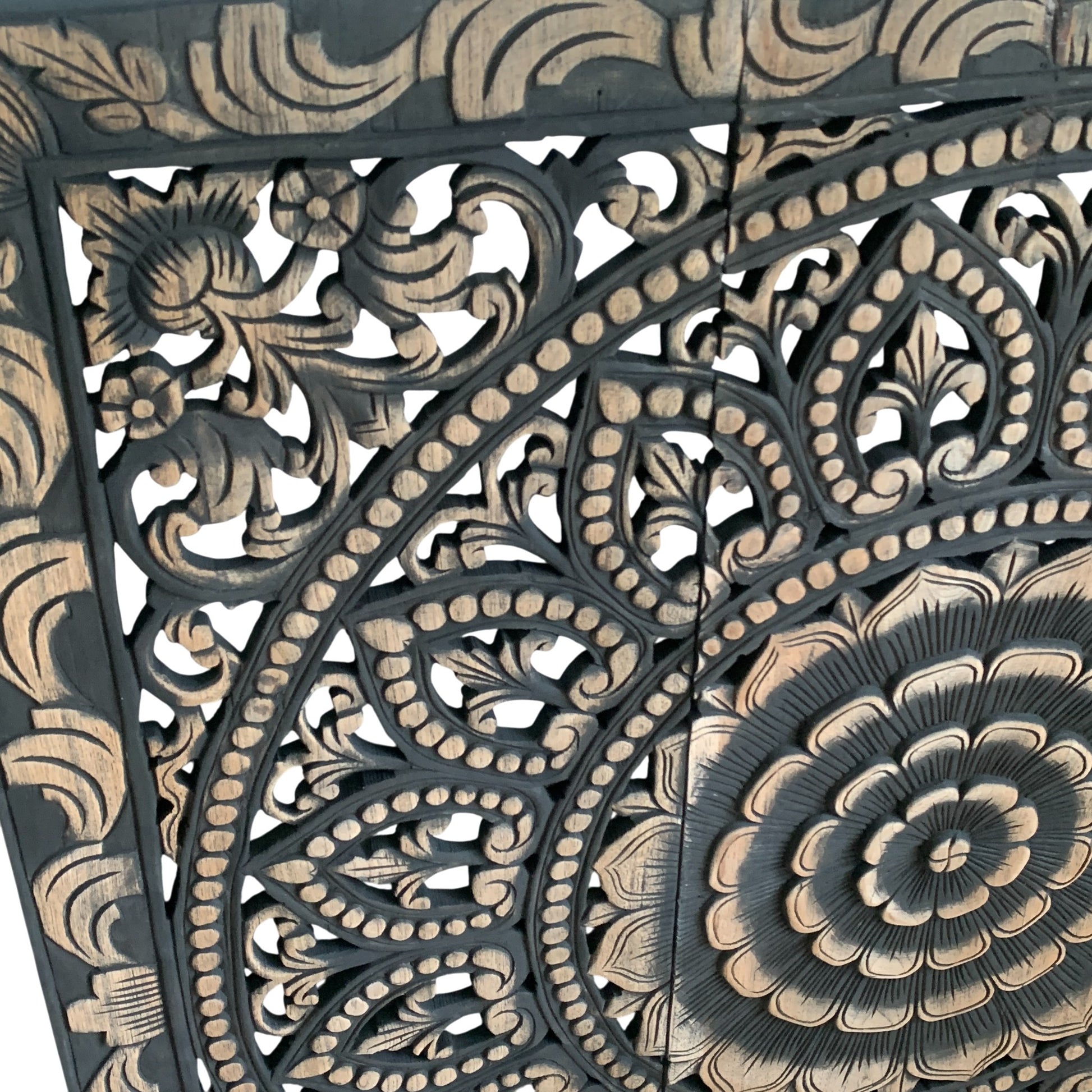 ミャンマー産の希少なチーク材を使用した、重厚感あふれる3連カービングパネルです。