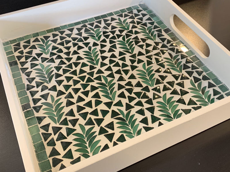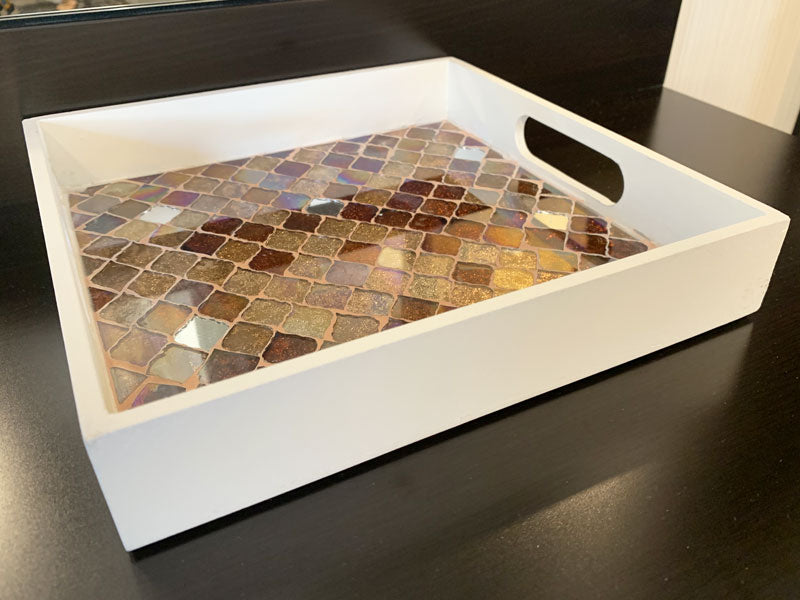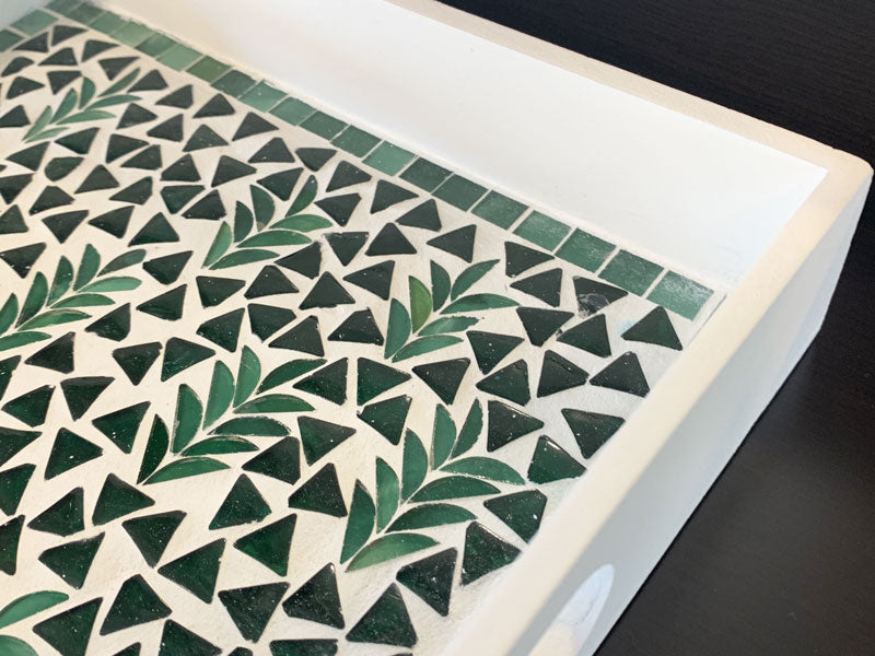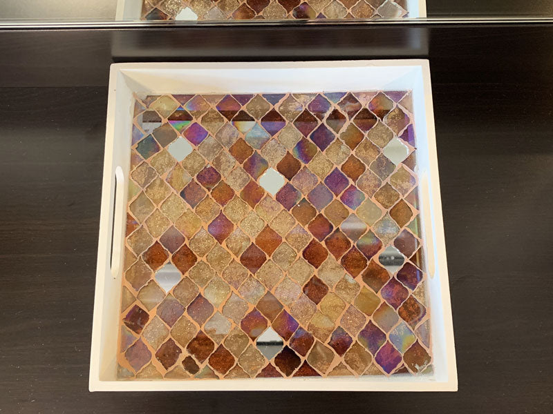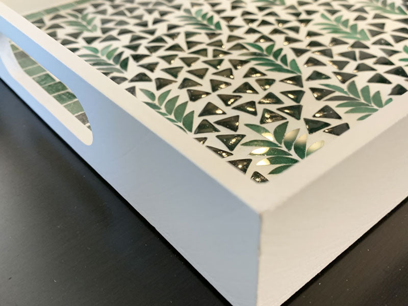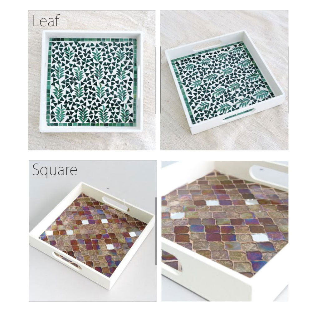 モダンな雰囲気を出す洗練されたオシャレなリーフ柄(Green)とスクエア(Pink)の2色ご用意。アジアと西洋の洗練さが混ざったようなトレイです。ちなみに、インドネシアでは風水に良いとされるのがキラキラと反射するモノ。このトレイは、色ガラスやラメの付いたガラスを貼り付けて 作られております。より小さなガラスを反射させるこのトレイは、風水的にも効果が高いそうです。