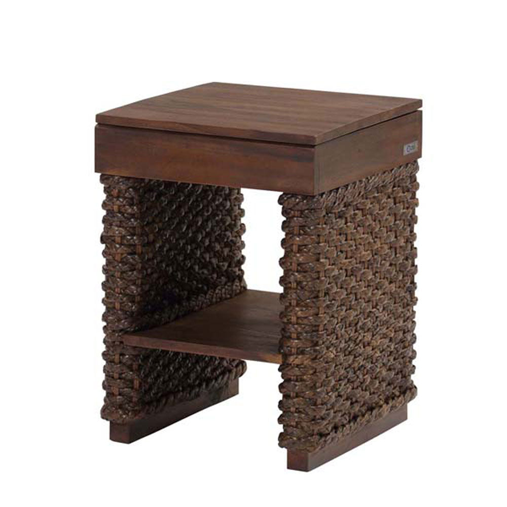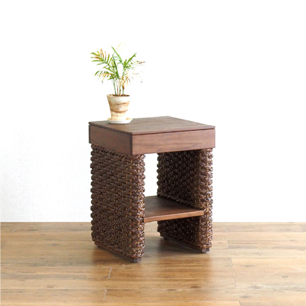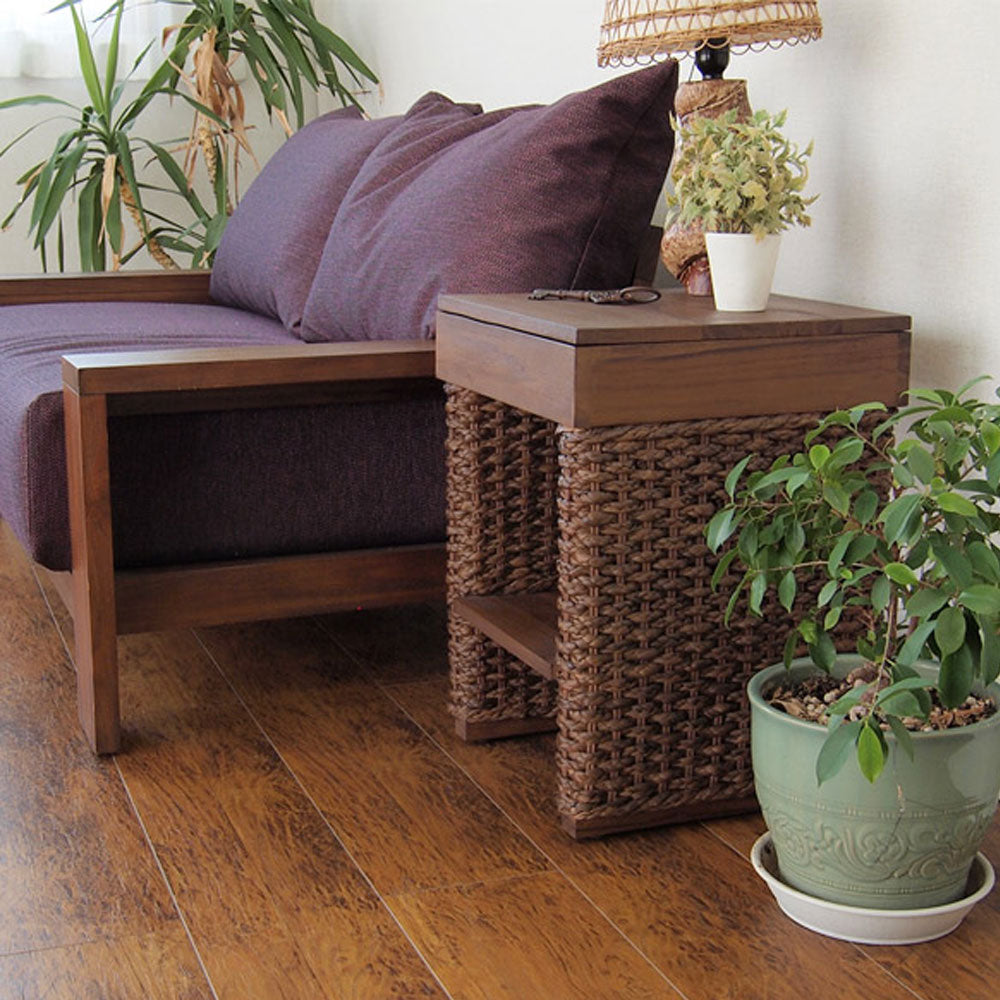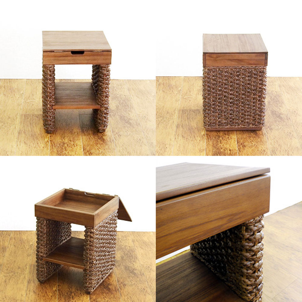 チーク材とウォーターヒヤシンスでつくられたアジアンテイストのサイドテーブル。テレビの横やソファーサイド、ベッドサイドなど様々な場面で大活躍。天板の収納部や、天板下の収納部の収納部にはちょっとした物を置くのにとっても便利。チークとウォーターヒヤシンスでアジアンな雰囲気をぐっと高めます。ベッドと合わせると、お部屋をあっという間にアジアンリゾートホテルの用な雰囲気に。1台あるととっても便利なサイドテーブルです。