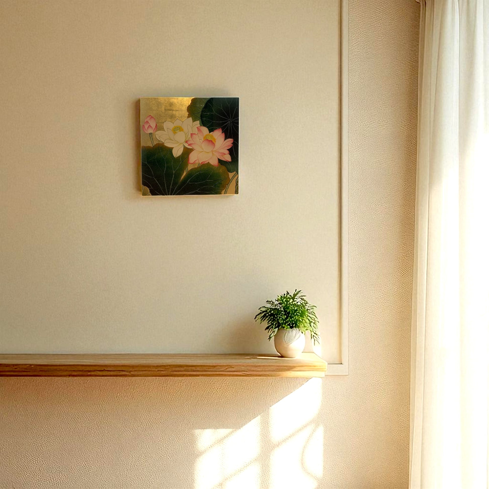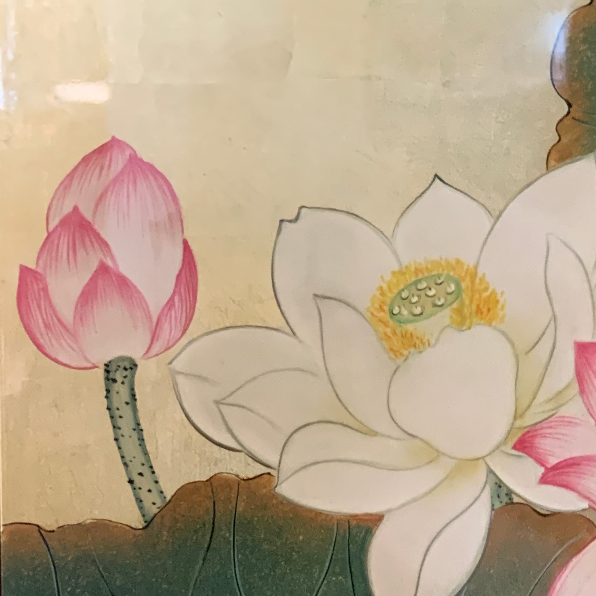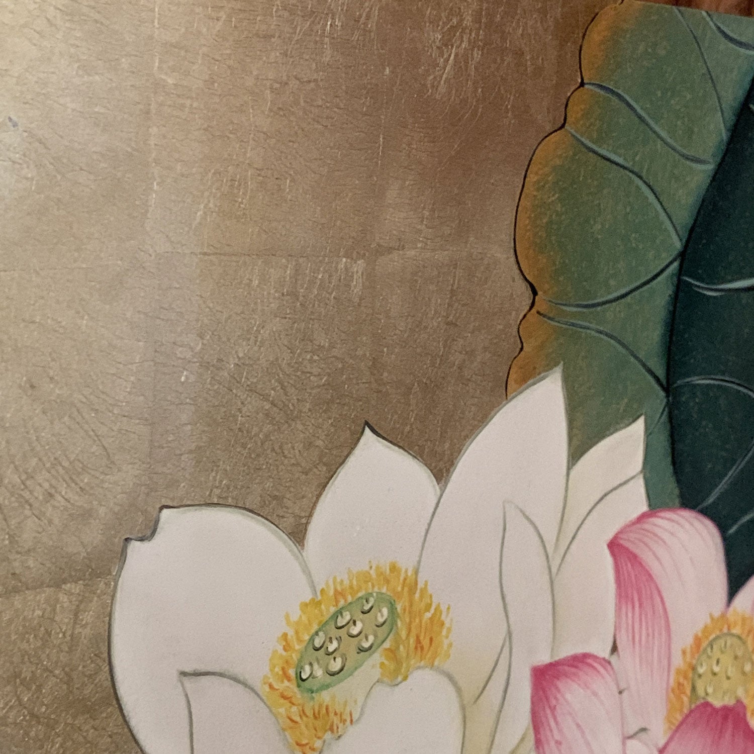 漆の上に ゴールドリーフ(金箔) を贅沢にあしらい、鮮やかな蓮(ロータス) を丁寧に手描きで表現しています。