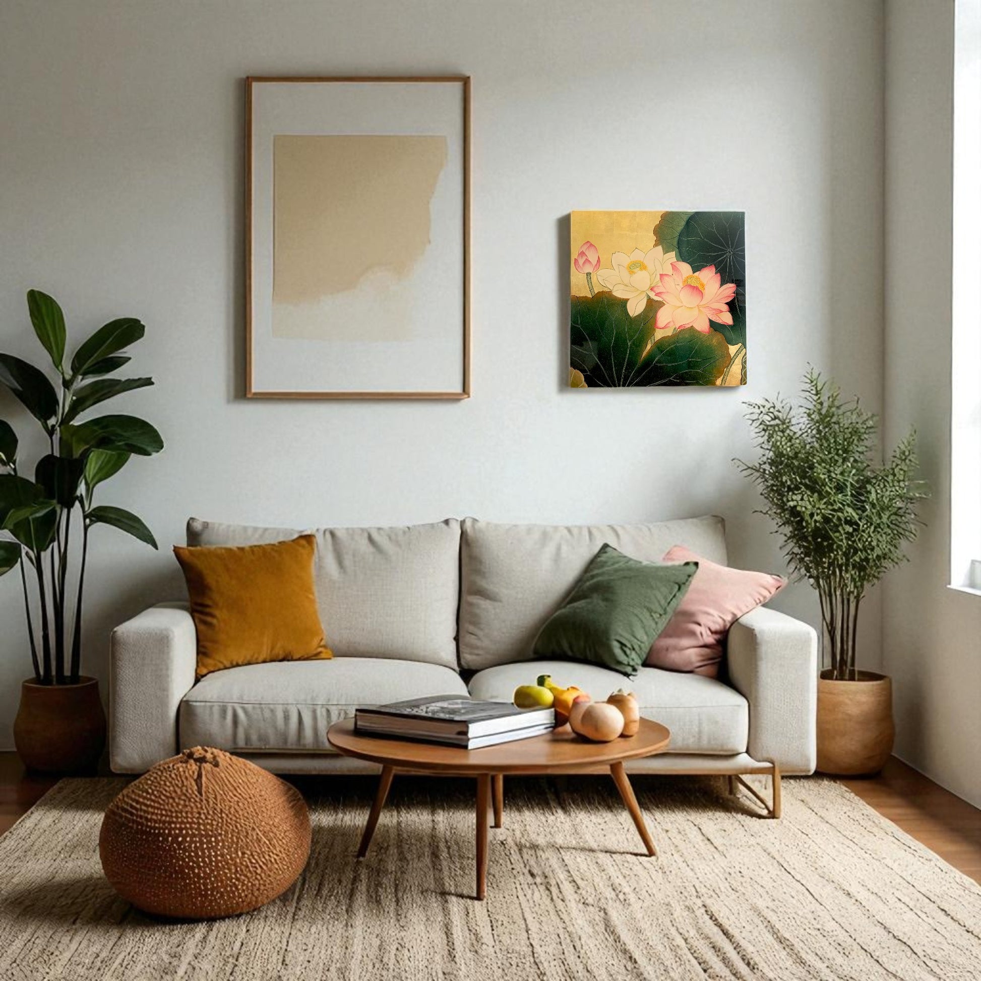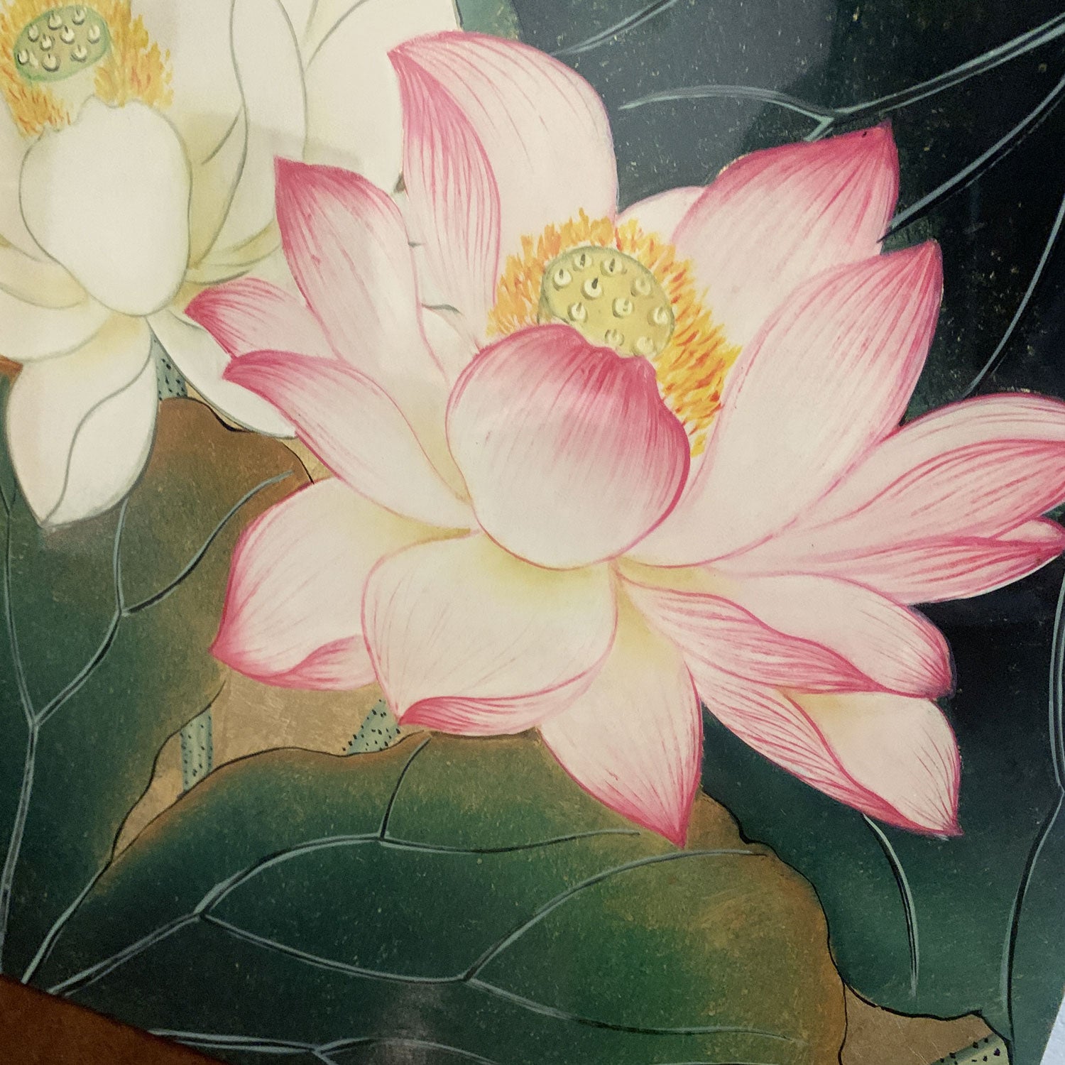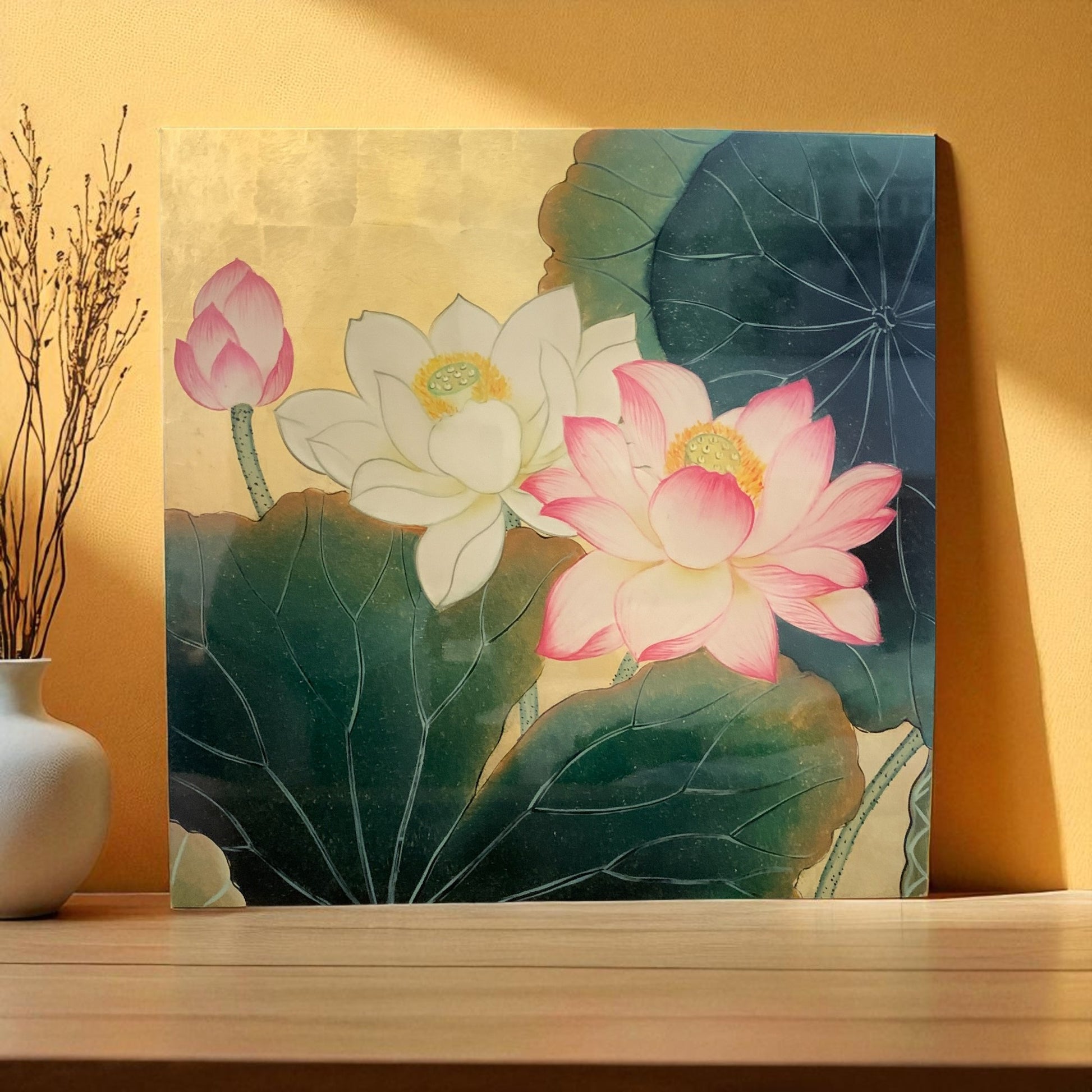 漆の上に ゴールドリーフ(金箔) を贅沢にあしらい、鮮やかな蓮(ロータス) を丁寧に手描きで表現しています。